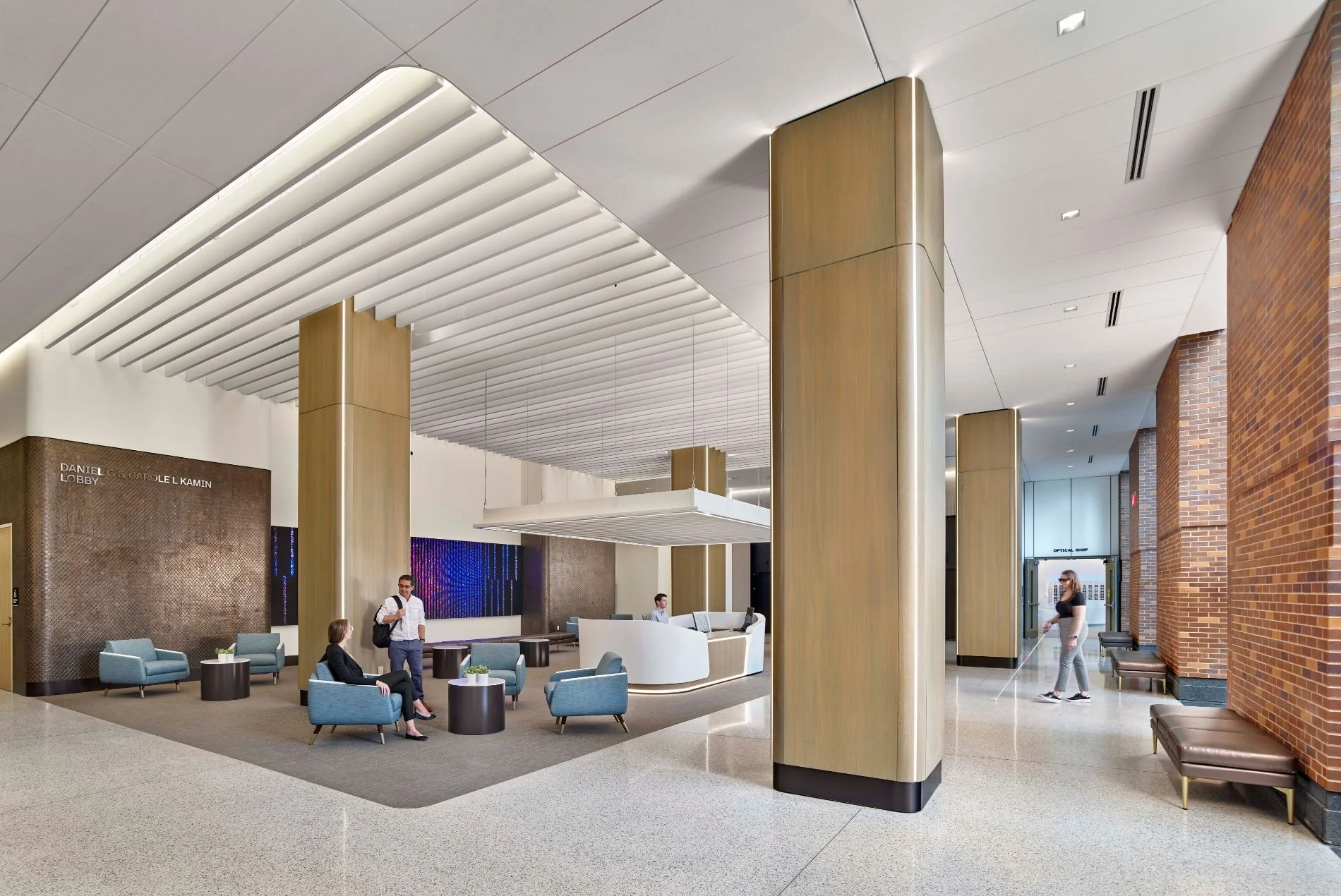 The design team was tasked with creating a sophisticated industrial-inspired space adjacent to the main lobby, seamlessly blending exposed elements with modern design features. The result is a dynamic yet inviting environment that complements the building’s overall aesthetic while maintaining functional flow.